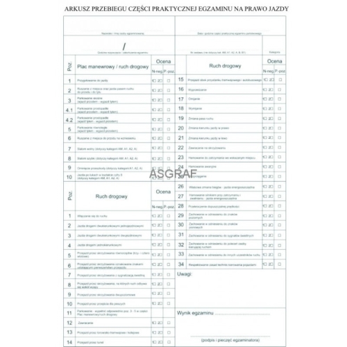 Arkusz przebiegu części praktycznej egzaminu na prawo jazdy - NOWY WZÓR ZGODNY Z NAJNOWSZYM ROZPORZĄDZENIEM.